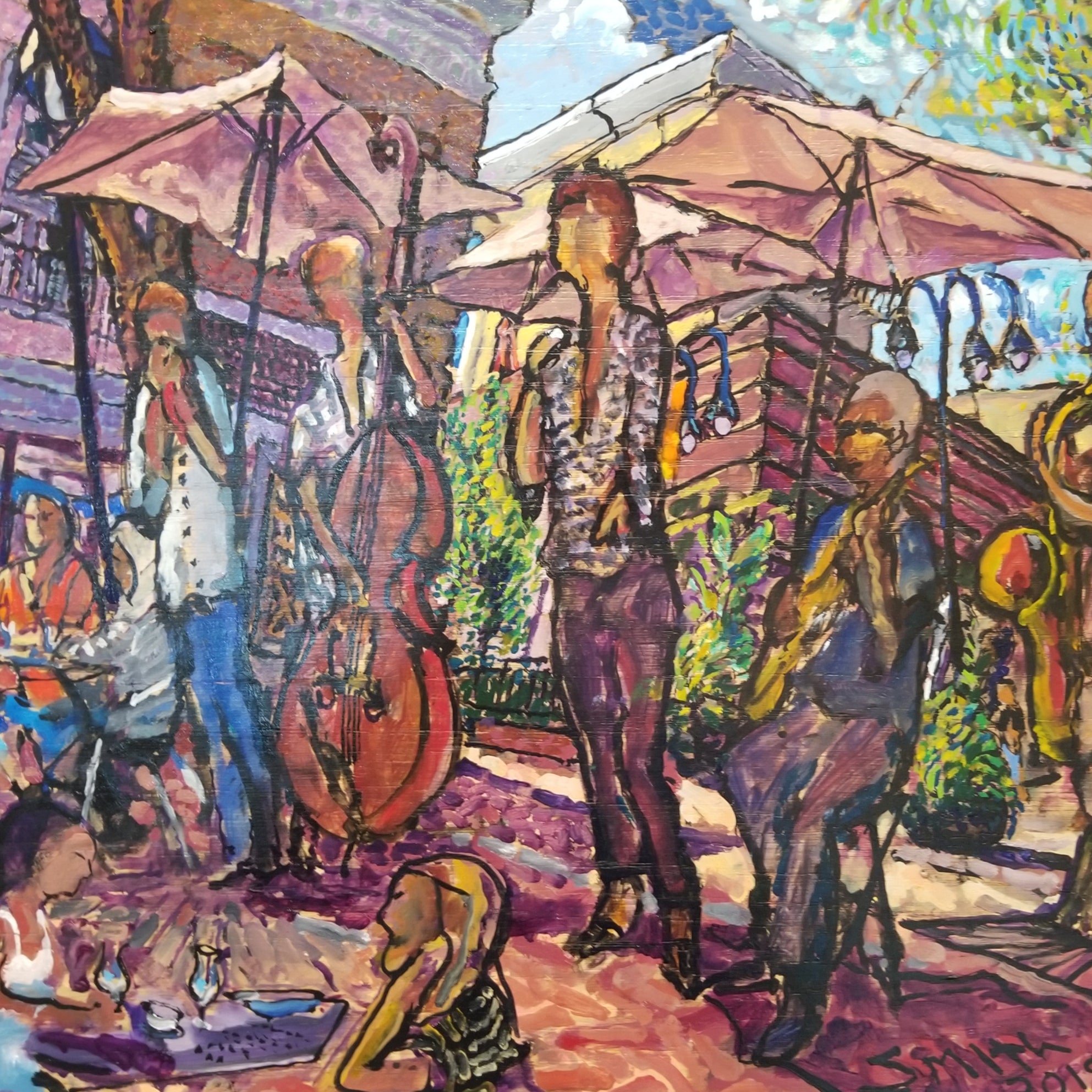 A vibrant Charlottesville street scene painted on the Downtown Mall, featuring lively color and detail, with signatures on the reverse from individuals depicted in the work.