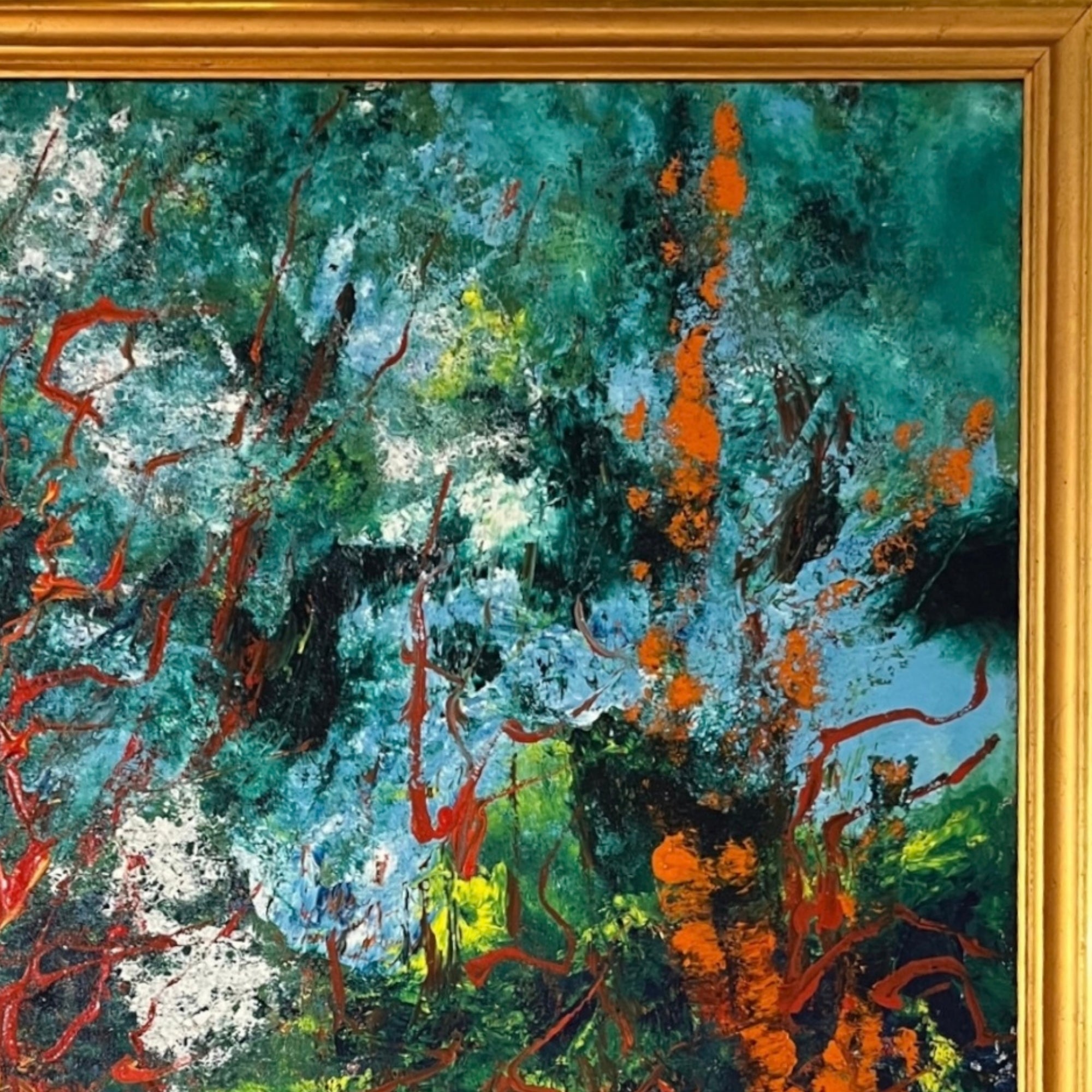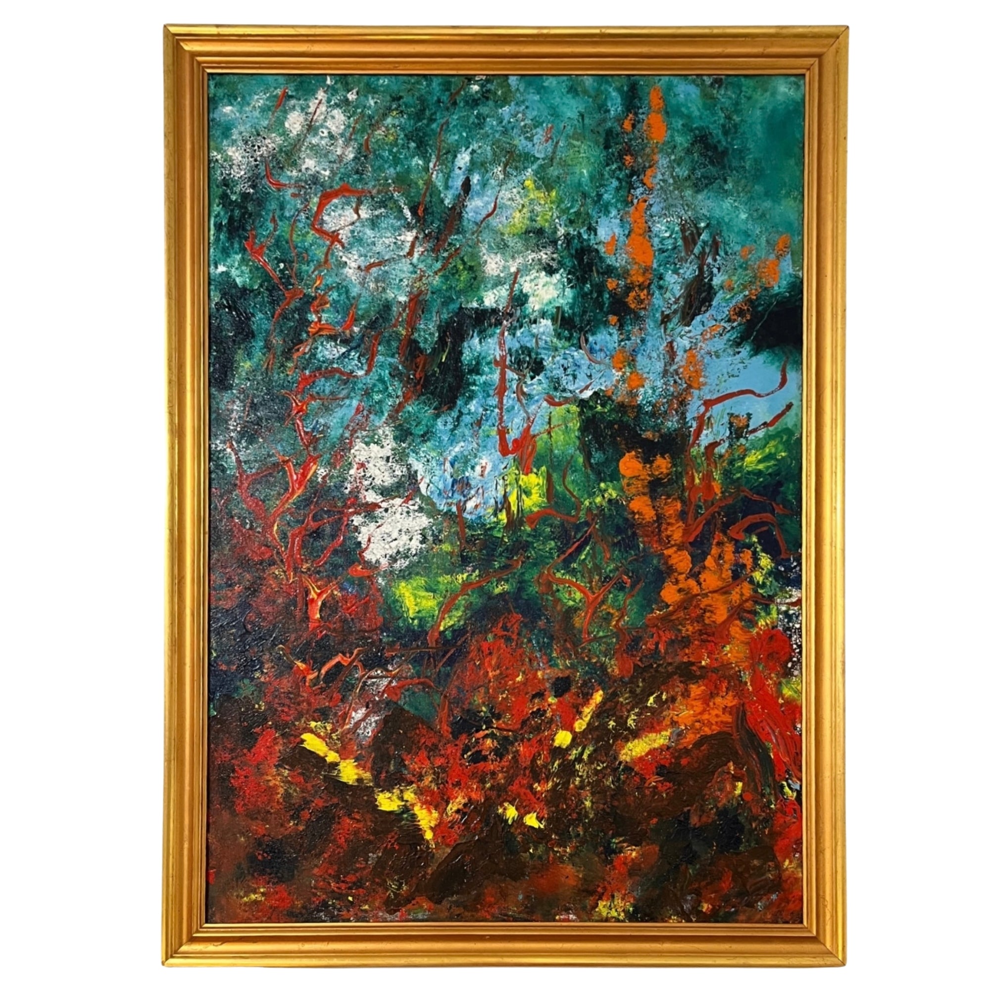 Abstract oil painting with layered texture and dense color fields. Saturated reds, greens, blues, and ochres interweave across the surface, creating a dynamic, vertical composition with strong visual movement. Presented in a gilt frame.