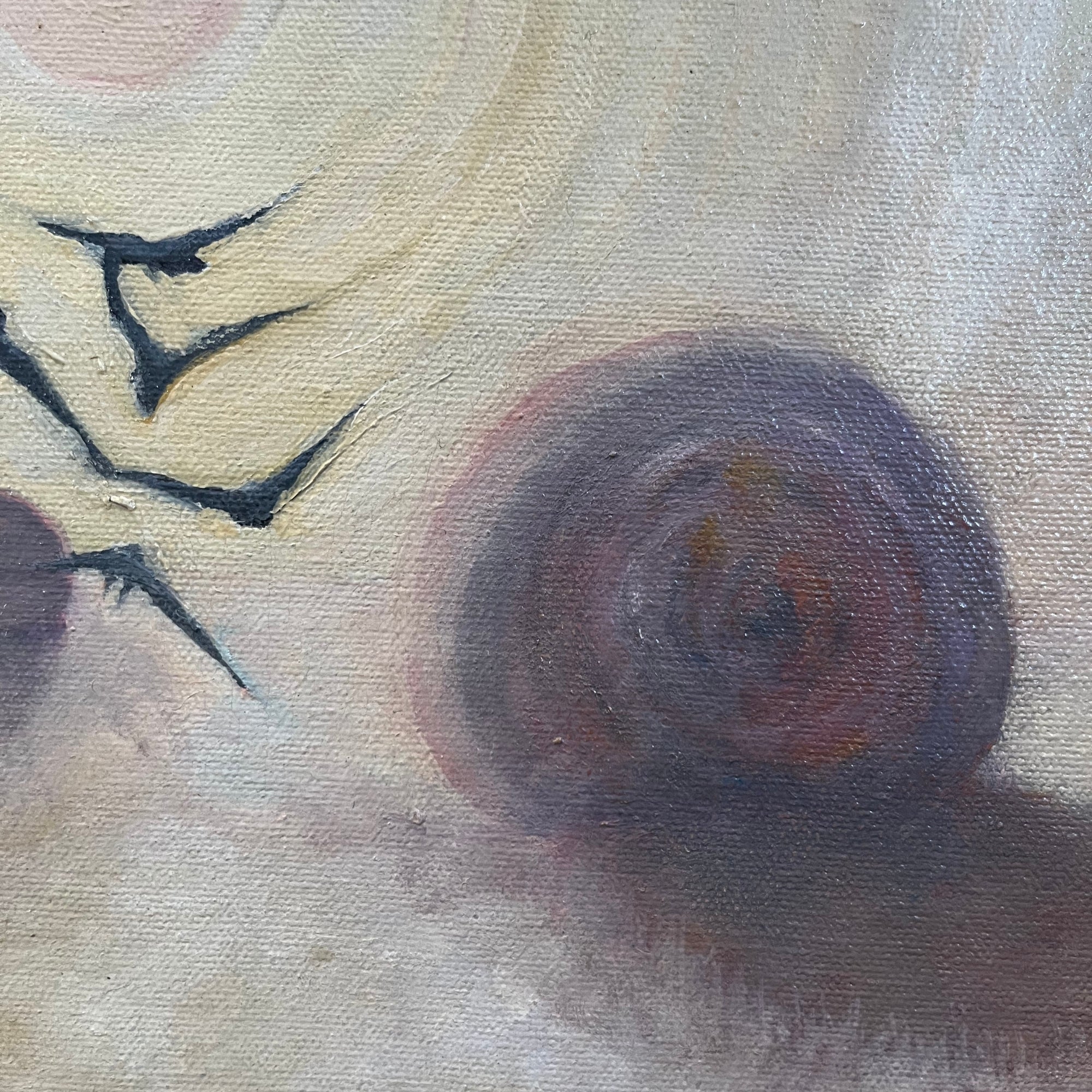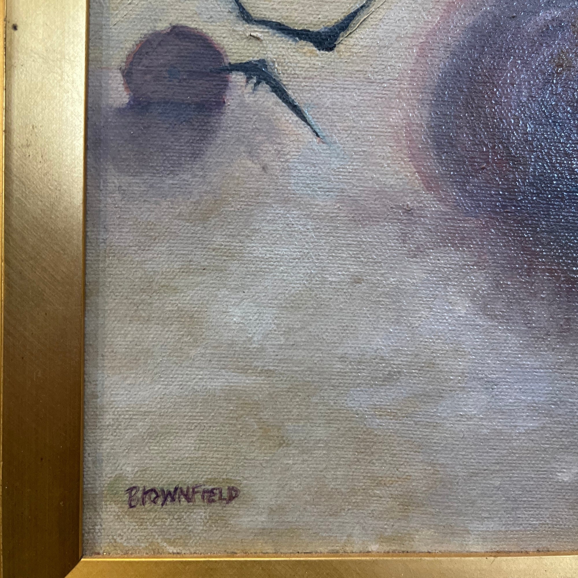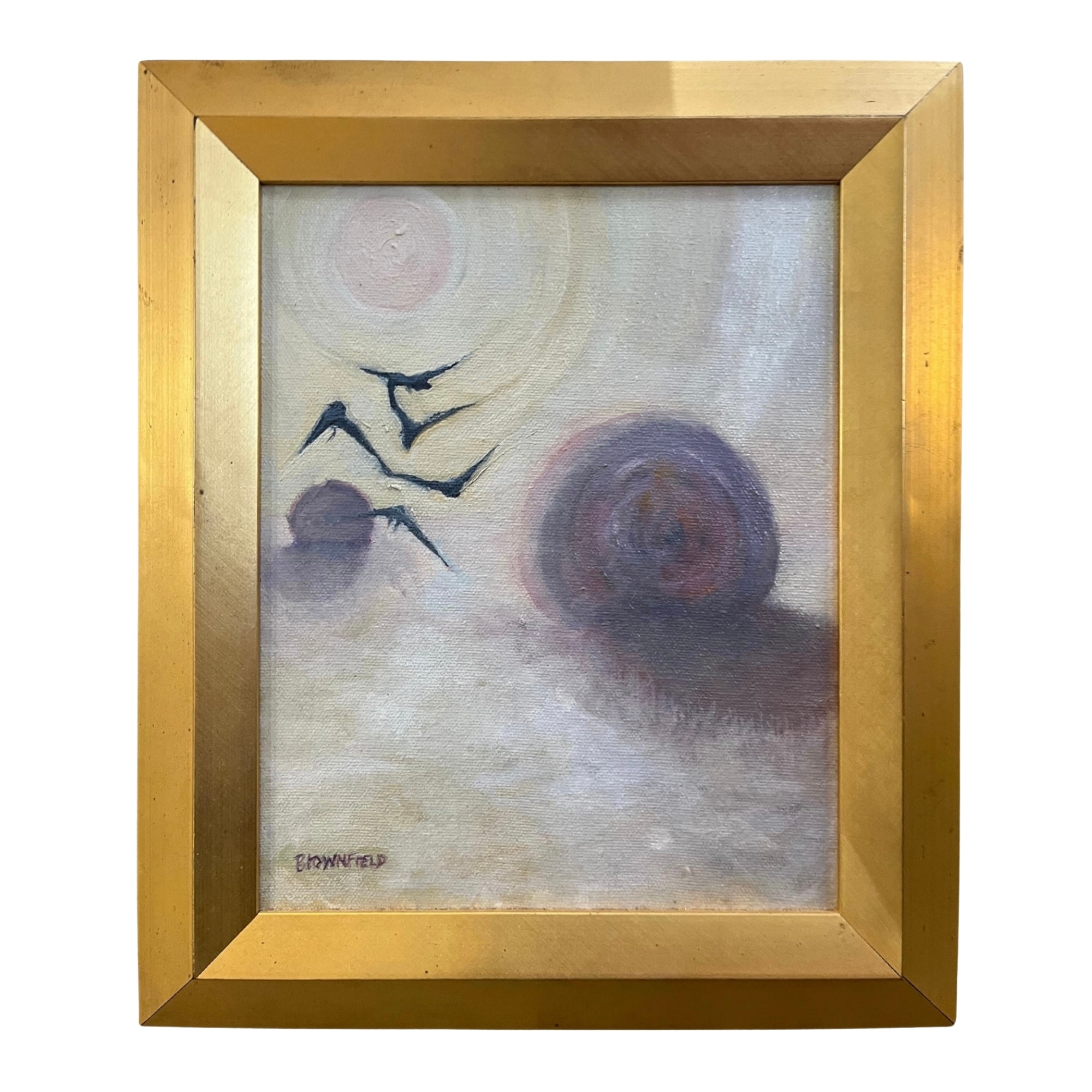 Signed painting titled In the Hay Field, depicting birds in flight over a misty rural landscape; signed lower left.