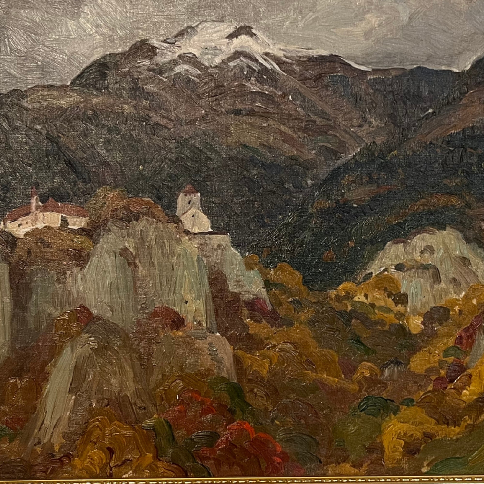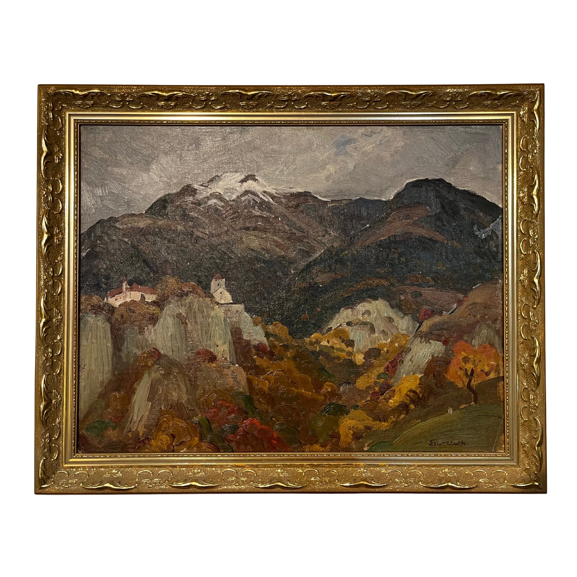 Oil landscape by American artist Eliot Candee Clark depicting a valley scene with clustered houses and autumn foliage. Signed lower right.
