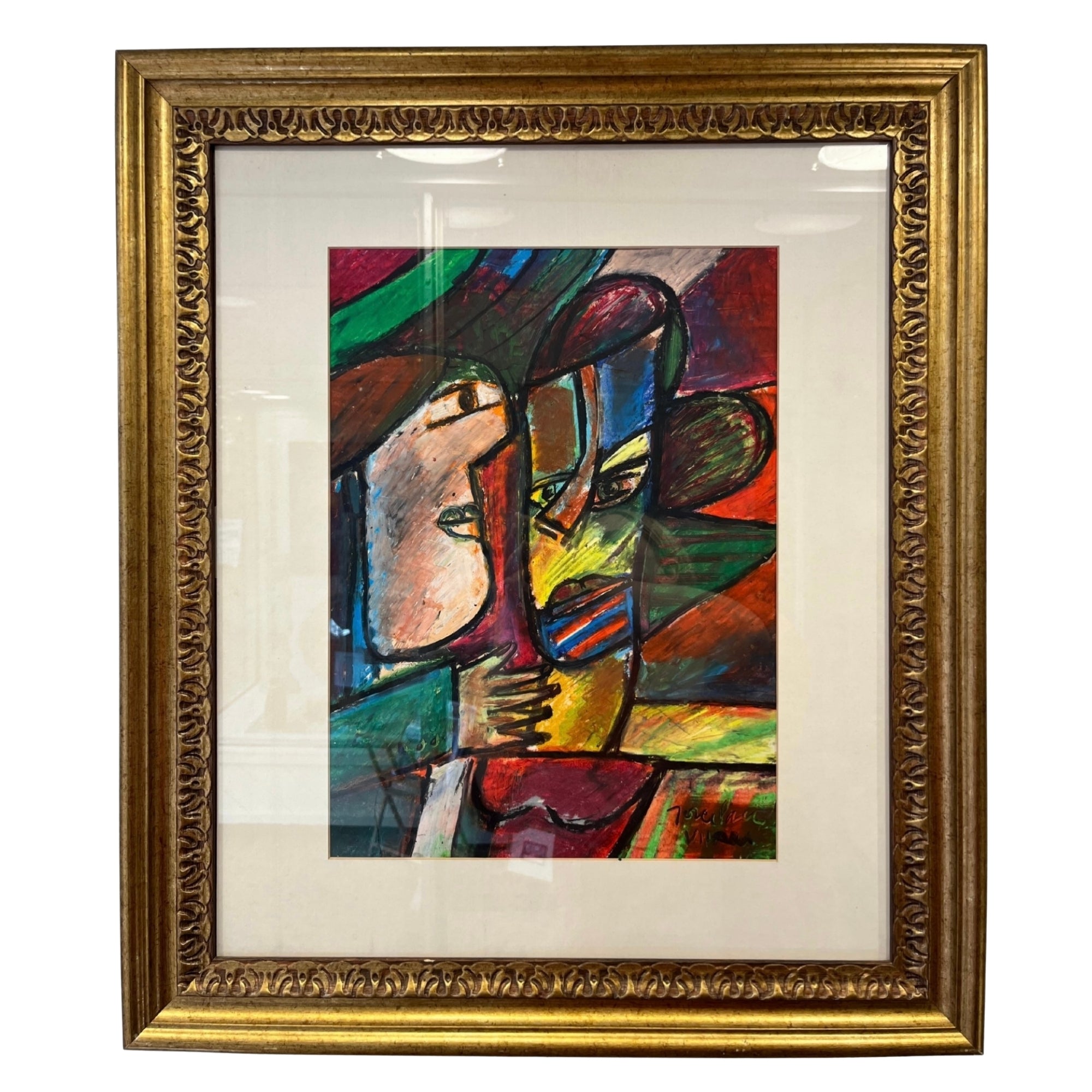 Colorful abstract composition depicting two closely positioned figures rendered in bold planes of color and expressive line. Signed lower right; inscribed on the verso “Para el Doyle’s House."
