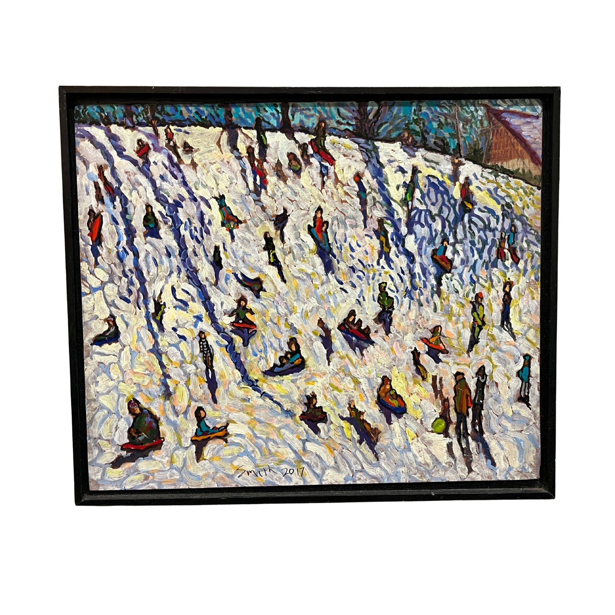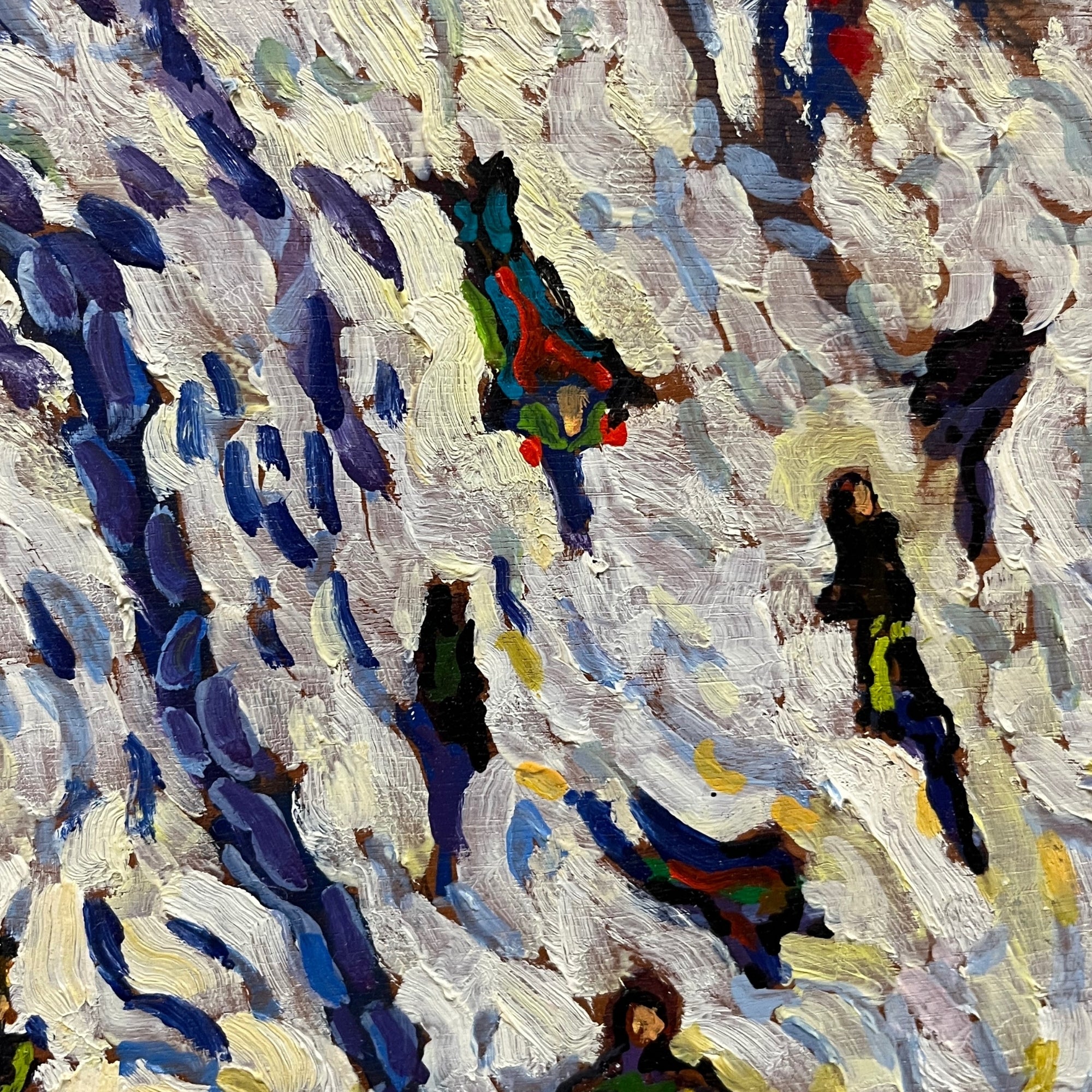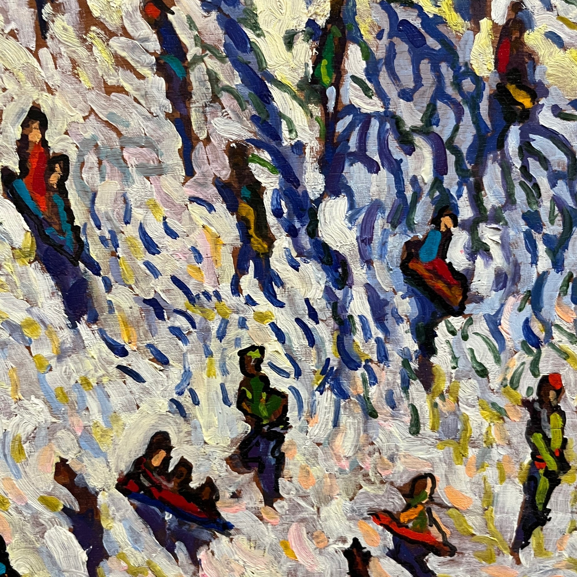 Oil painting depicting a winter scene at Washington Park, with figures scattered across a snow-covered hillside. Thick, energetic brushwork and compressed perspective convey movement and seasonal atmosphere. Signed and dated lower center.