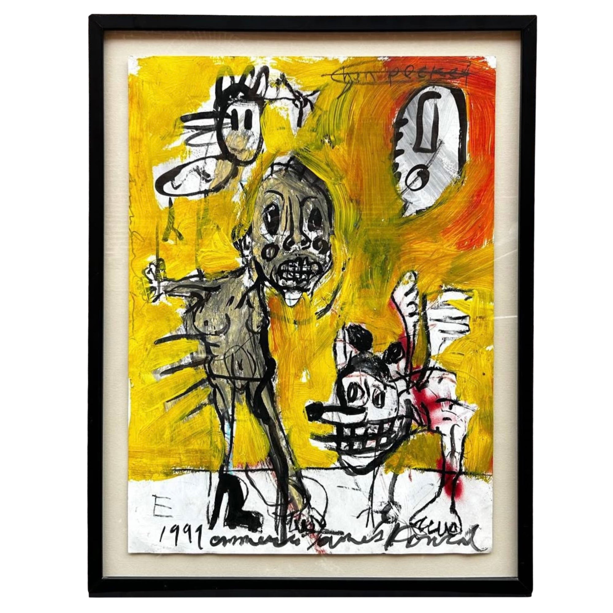 A rare early work by Los Angeles artist Emmeric Konrad, Hen Pecker (1991) exemplifies the artist’s raw, expressive energy and darkly humorous surrealism. This mixed media painting bursts with vivid yellows, greens, and reds, creating a chaotic dreamscape inhabited by three distorted, cartoon-like figures. The central nude, poised in a single high heel, is flanked by a winged creature reminiscent of a warped Mickey Mouse — a striking embodiment of Konrad’s signature blend of street art, pop culture, and psychological intensity.