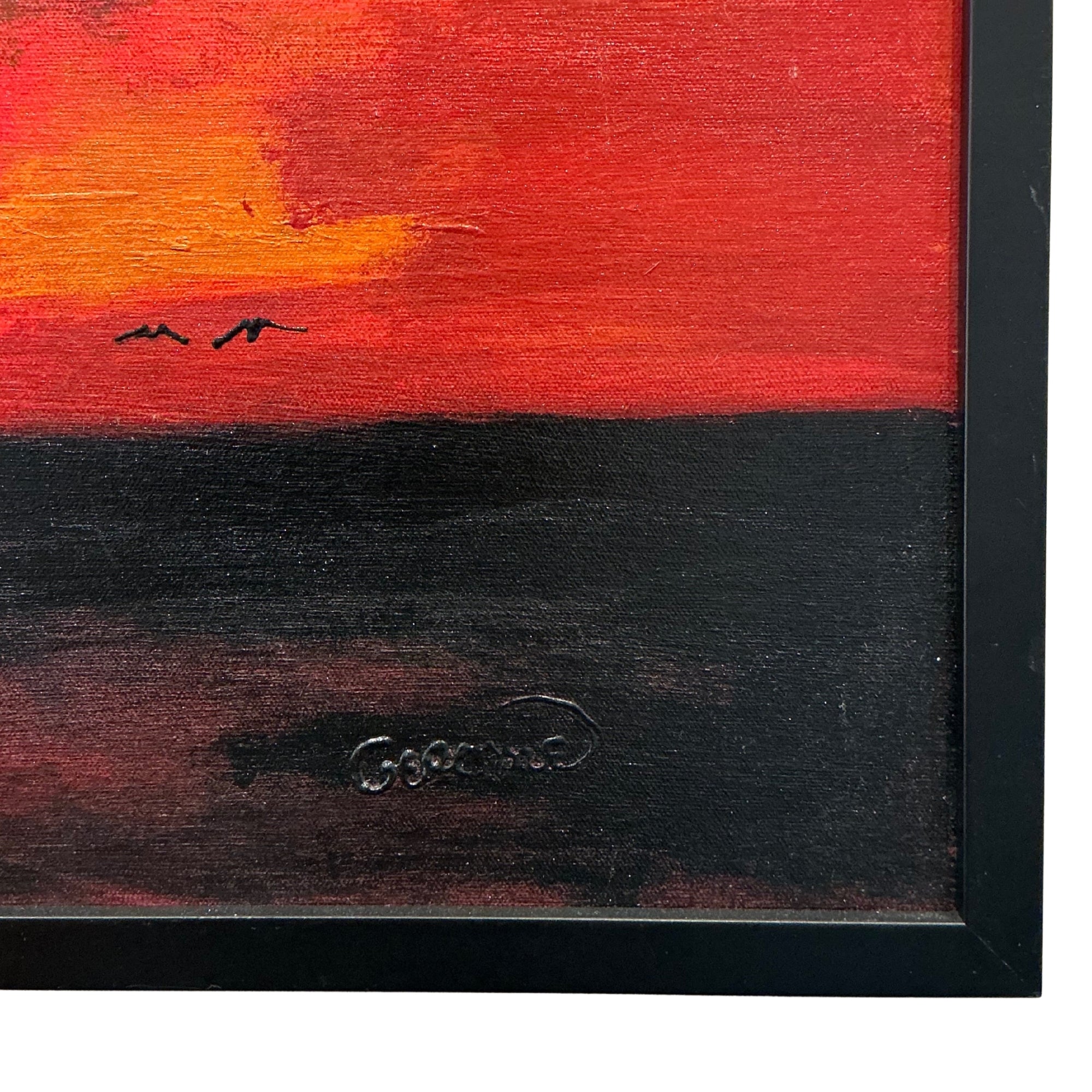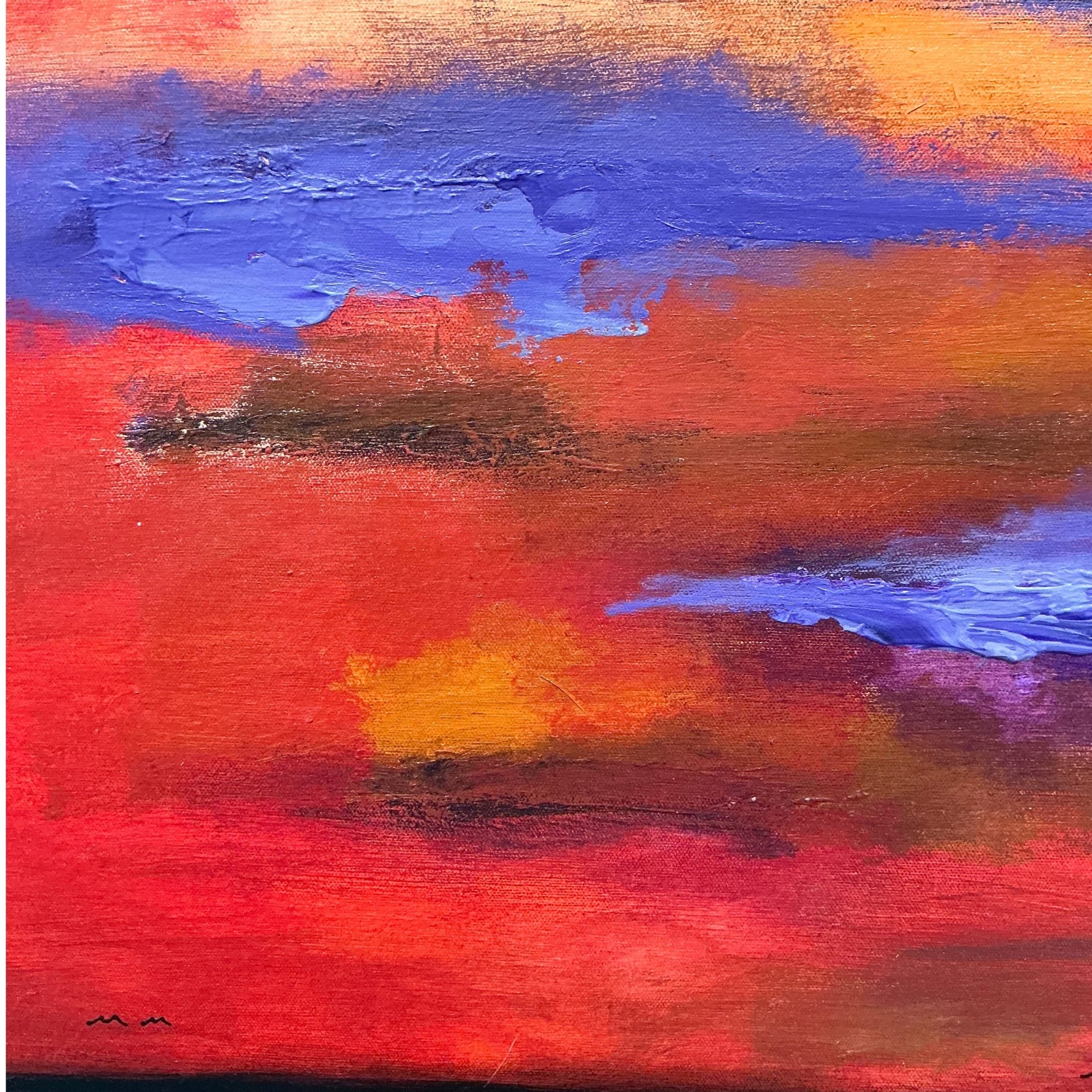 This striking oil painting by Gerome Meminger captures the dynamic energy of a vibrant sunset, rendered in his signature abstract and impressionistic style. The composition blends vivid color fields and rhythmic patterns, evoking movement and emotion, with the expressive use of color and form creating a powerful visual experience.