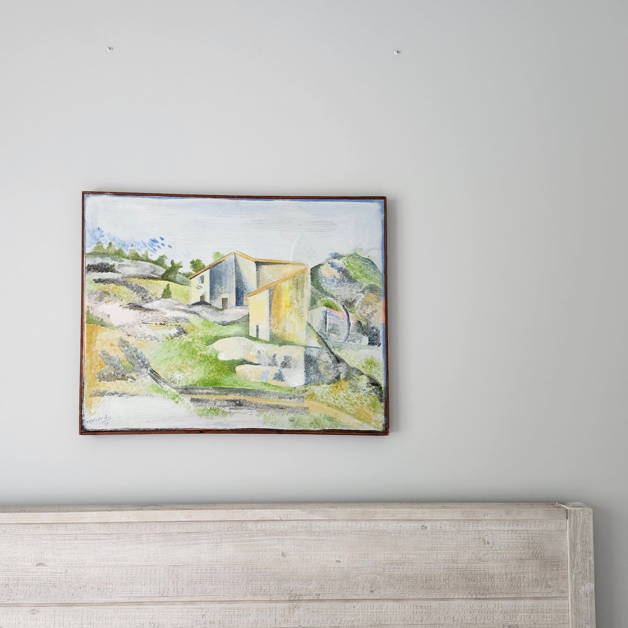 A contemporary landscape by C. Heliardo that blends soft geometric forms with muted color fields, evoking hillside architecture through a modernist lens.