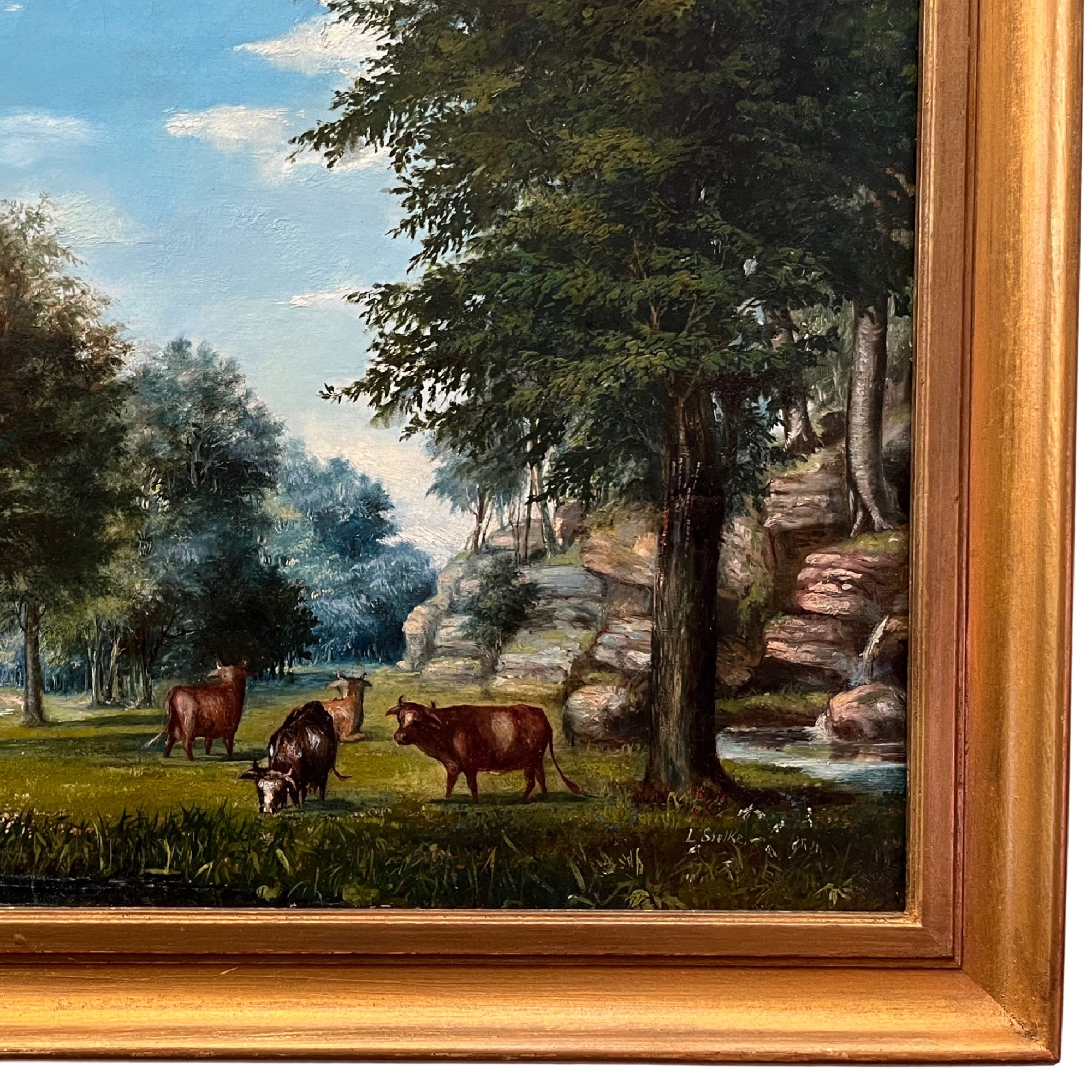 A tranquil pastoral scene depicting grazing cattle beside a wooded stream, rendered with warm light and fine naturalistic detail.