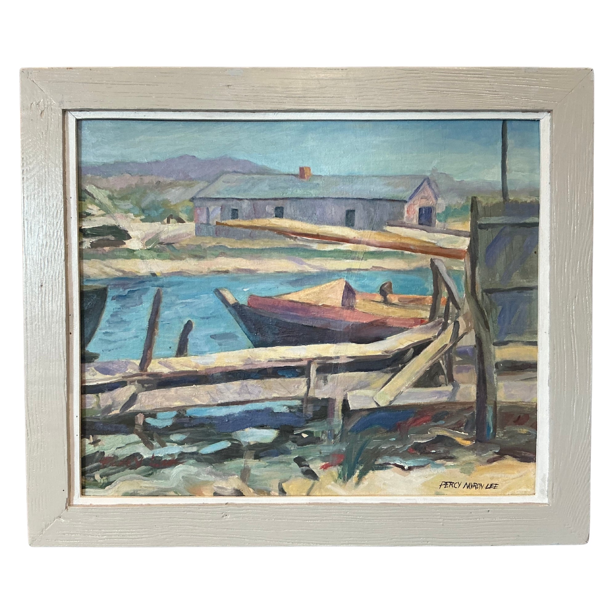 A lively harbor scene depicting a weathered dock and moored boats beneath bright coastal light. Lee’s confident brushwork and layered color palette bring warmth and movement to this intimate view of maritime life.